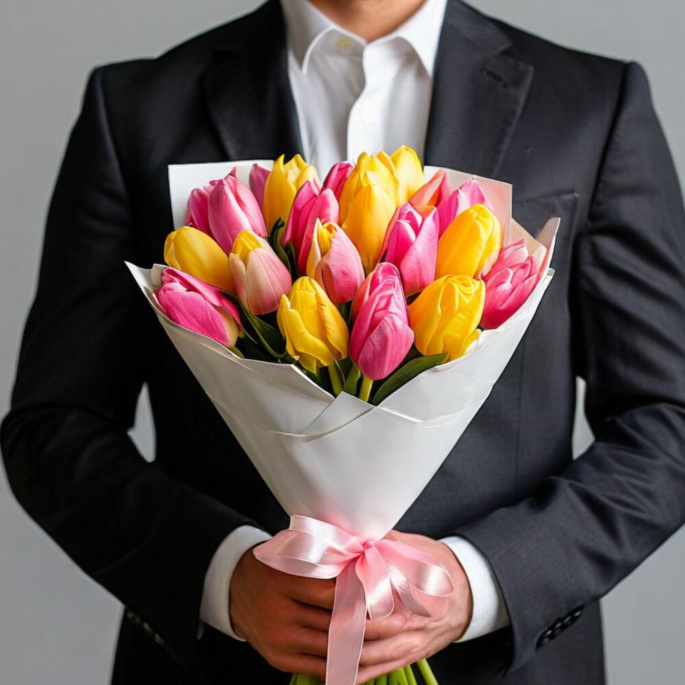 Яркий букет из тюльпанов – розовые и желтые 💛🎀